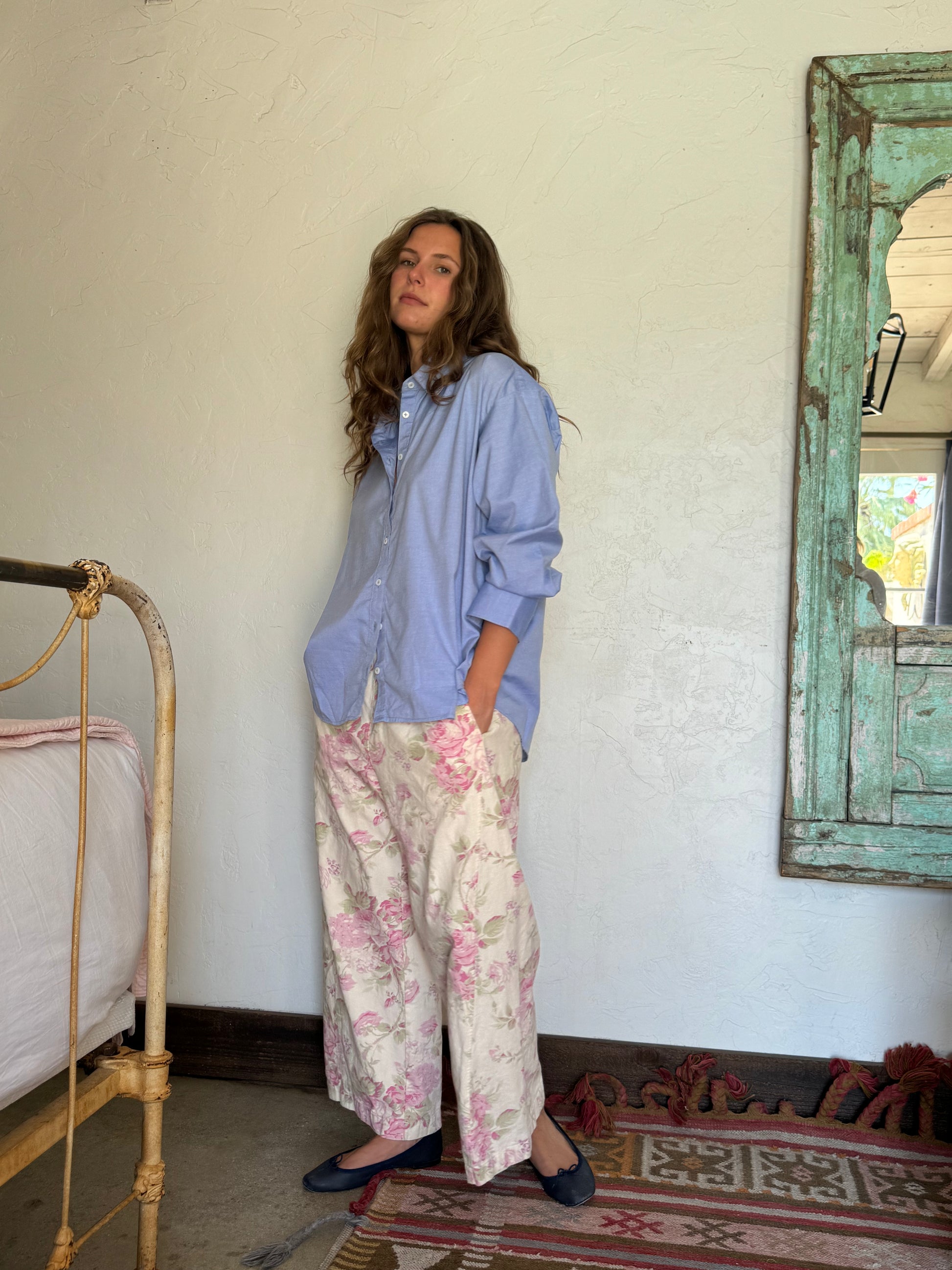 Blue button up shirt with an oversized boyfriend fit is a modern interpretation of a classic. Made from up-cycled Italian oxford cotton and the boxie style exudes comfort . this shirt it has been crafted with care in the heart of Los Angeles, each piece is a testament to both style and sustainability. The relaxed silhouette allows for a comfortable fit that complements any wardrobe. Small batch production made from dead stock for exclusivity.