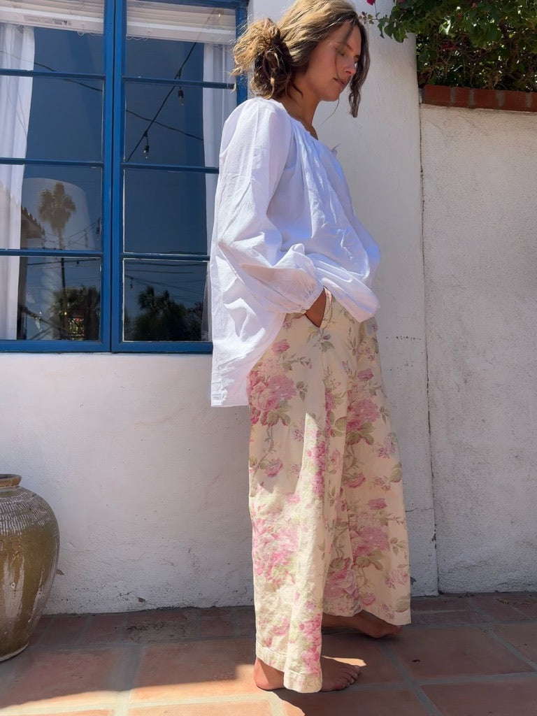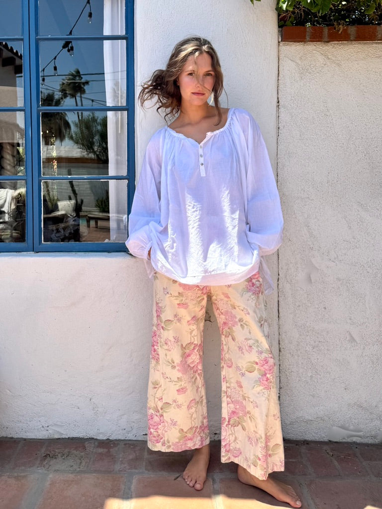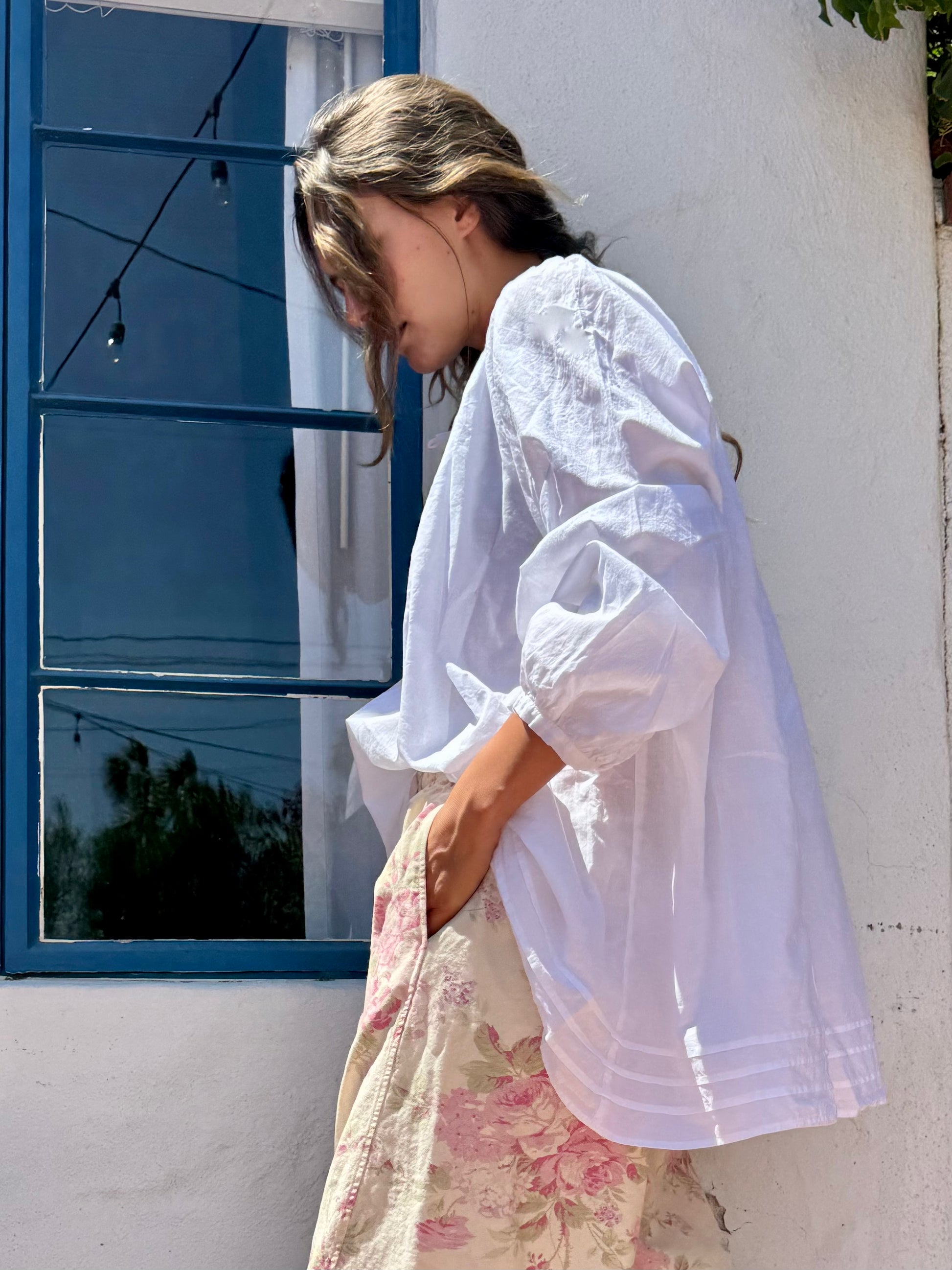 Cotton white blouse features long sleeves, button front placket & is finished with charming pin tuck details at the hem. Boho style blouse was crafted in downtown Los Angeles using carefully selected delicate cotton fabric. limited up-cycled fabrics by skilled artisans.