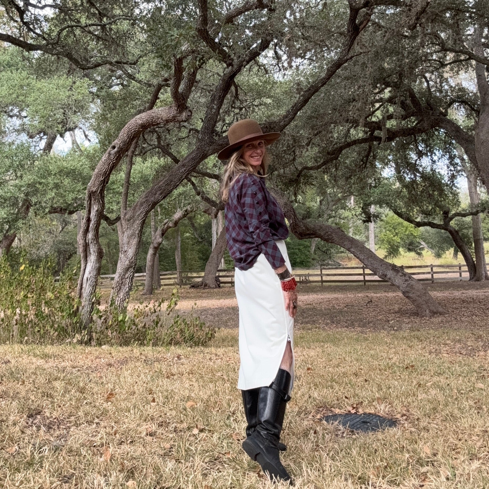 Crafted from salvaged dead=stock fabric right here in Los Angeles, this chalk white denim twill skirt brings an edgy twist to timeless style. Dual side zippers serve up both function and flair, contrast twill tape at the waist & a hint of elasticity keeps things comfy without compromising the sharp, straight silhouette. Those heavy-duty zippers? They're the real showstopper—turning a simple skirt into something with serious personality. Part of our limited collection, this piece proves that sustainable fashion doesn't mean sacrificing style.