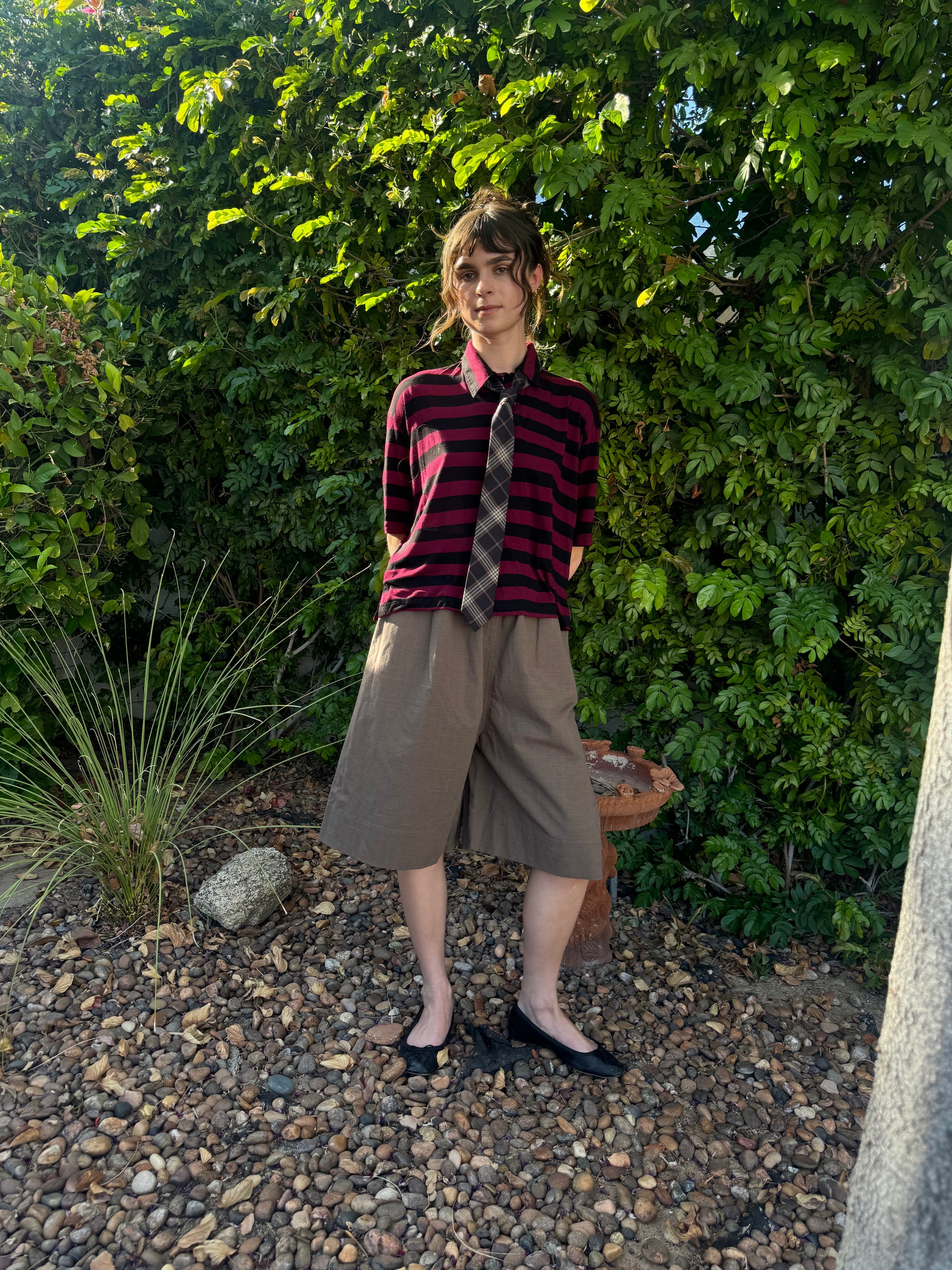 Culotte shorts are crafted from up cycled fabric, this subtle plaid short is the perfect replacement for jeans. Slide into fall with this basic, sweater, heels, boots, or trainers, you'll be ready to go anywhere. Culotte shorts have an elastic waist and soft pleating make for an easy adjustment to wear up high on the waist or down on the hips and course pockets. Made in Los Angeles from dead stock fabric.