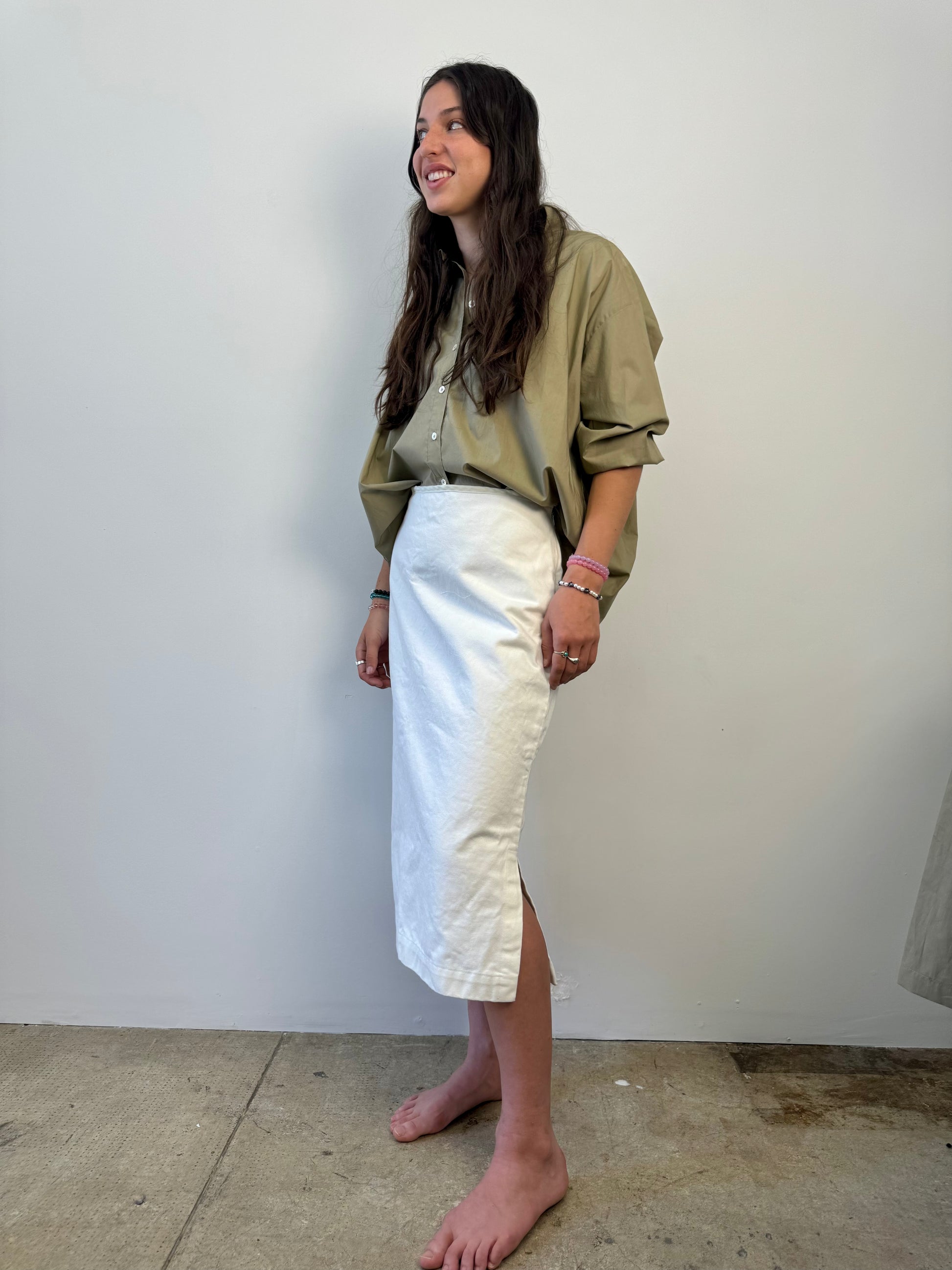 Classic khaki cotton shirt in Italian cotton. Get ready for fall transition in crisp cotton. Made from dead stock fabric sourced in Los Angeles. You will exudes a classic crisp look, perfect for an afternoon in the city. This blouse captures the essence of both classic and contemporary luxury, and is as functional as it is fashionable. Limited small batch collection.