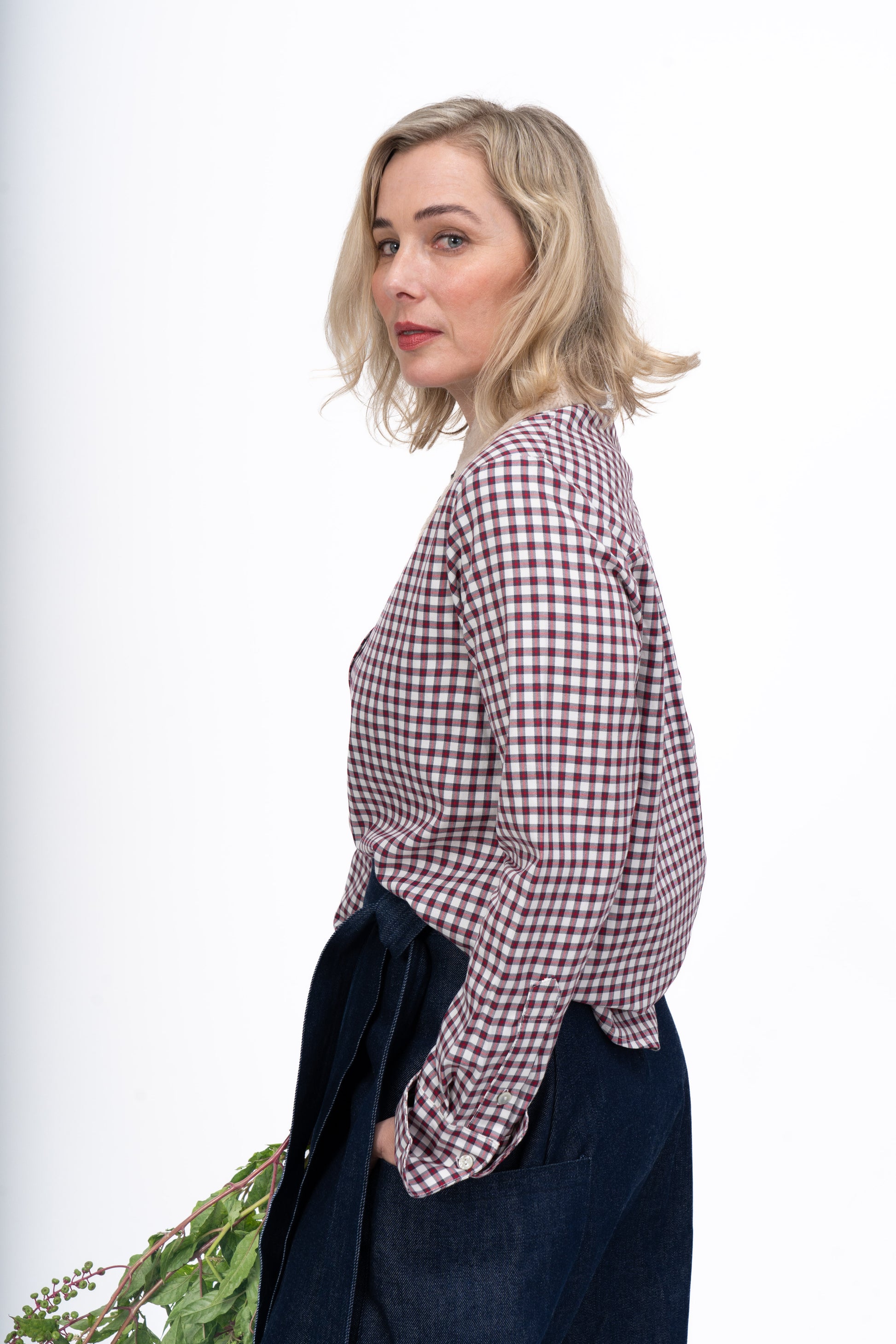 Cotton shirt in red & navy check. Introducing our 95% polished cotton button-up blouse, a true testament to style and sustainability. Crafted with care in the heart of LA, each blouse features up-cycled shell buttons, adding a unique touch of authenticity to your wardrobe. The French cuffs and covered placket add a touch of elegance, allowing you to effortlessly transition from day to night.