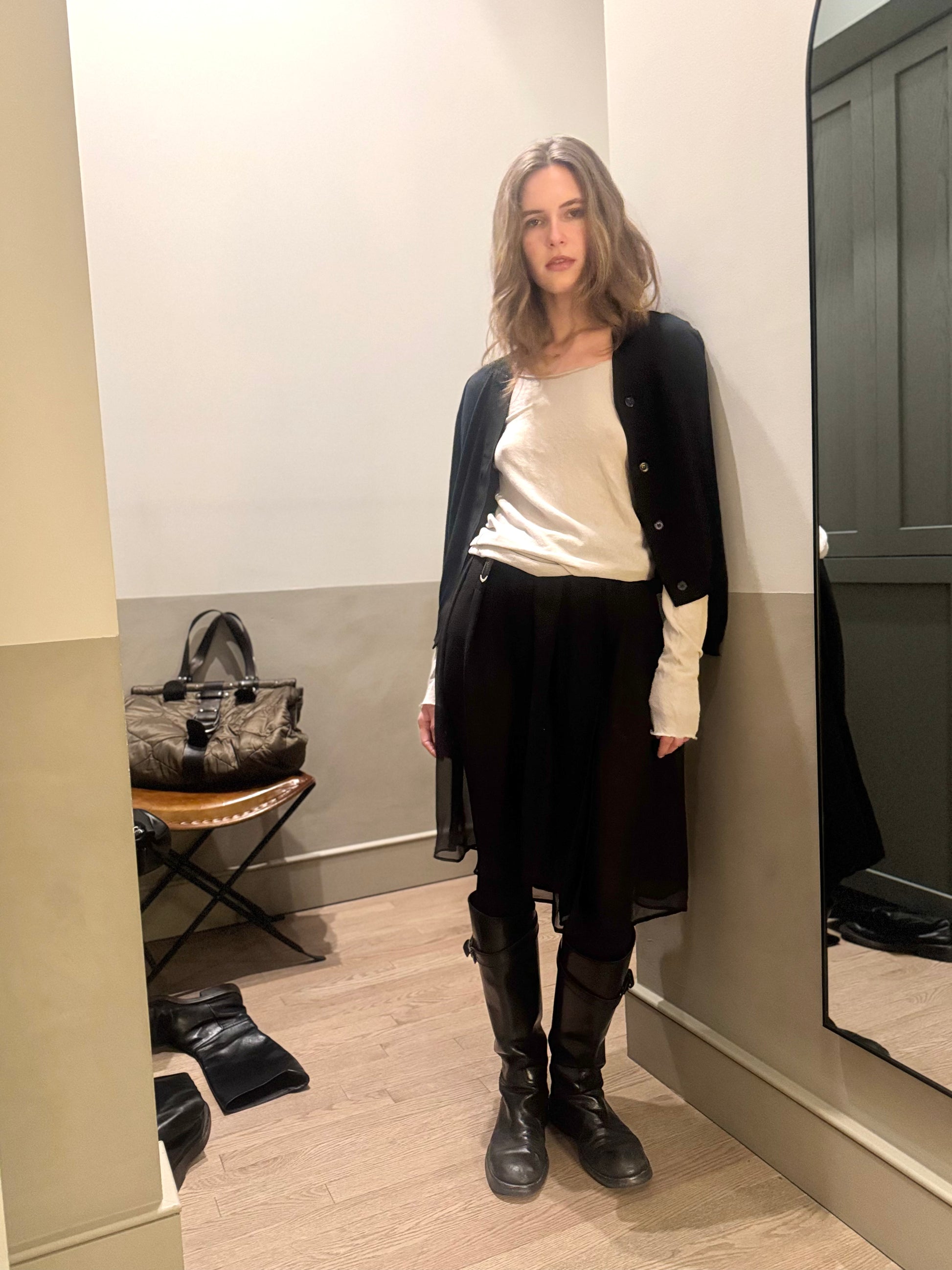 This refined wrap skirt transforms deadstock silk crepe into a statement of quiet luxury. Sheer black fabric flows with understated elegance, complemented by delicate ruffled pleats that catch light with subtle sophistication. The adjustable fit ensures a polished silhouette tailored to your frame—sustainable style that never compromises on grace.