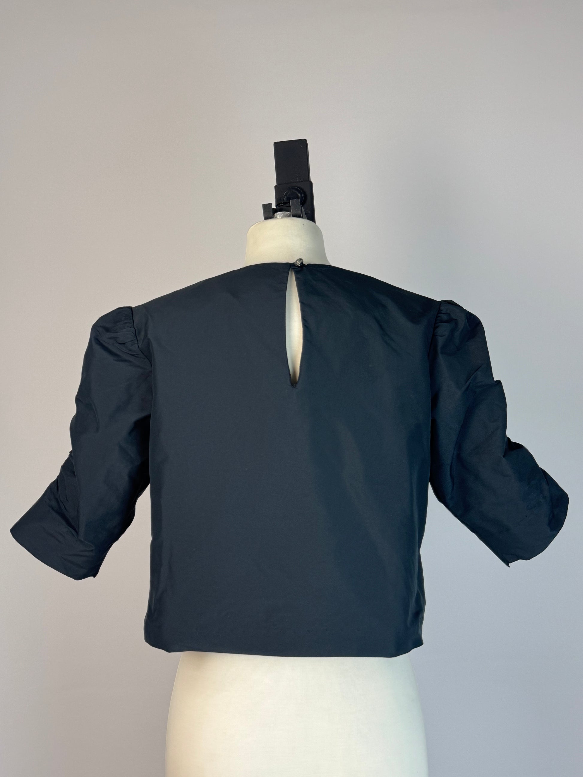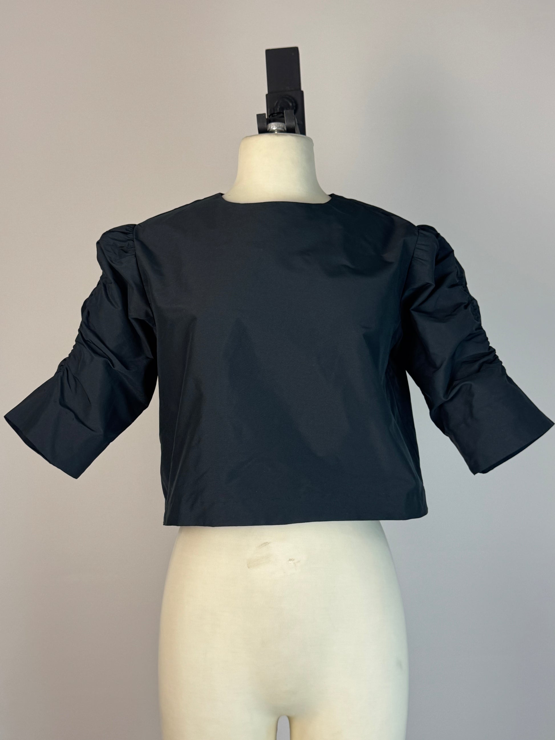 Black taffeta 3/4” puff sleeve shirt with solo back button