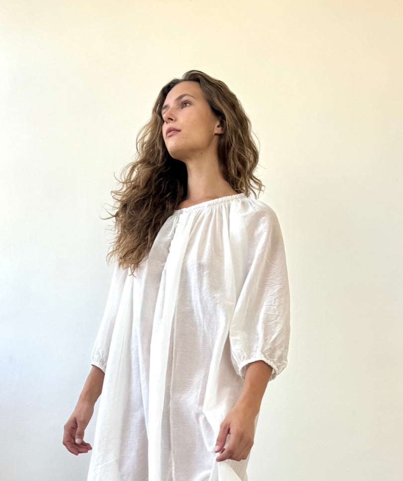 Crafted from delicate cotton voile, this ethereal white dress embodies understated elegance with its sheer, flowing silhouette. Thoughtfully upcycled, it merges timeless sophistication with conscious design.